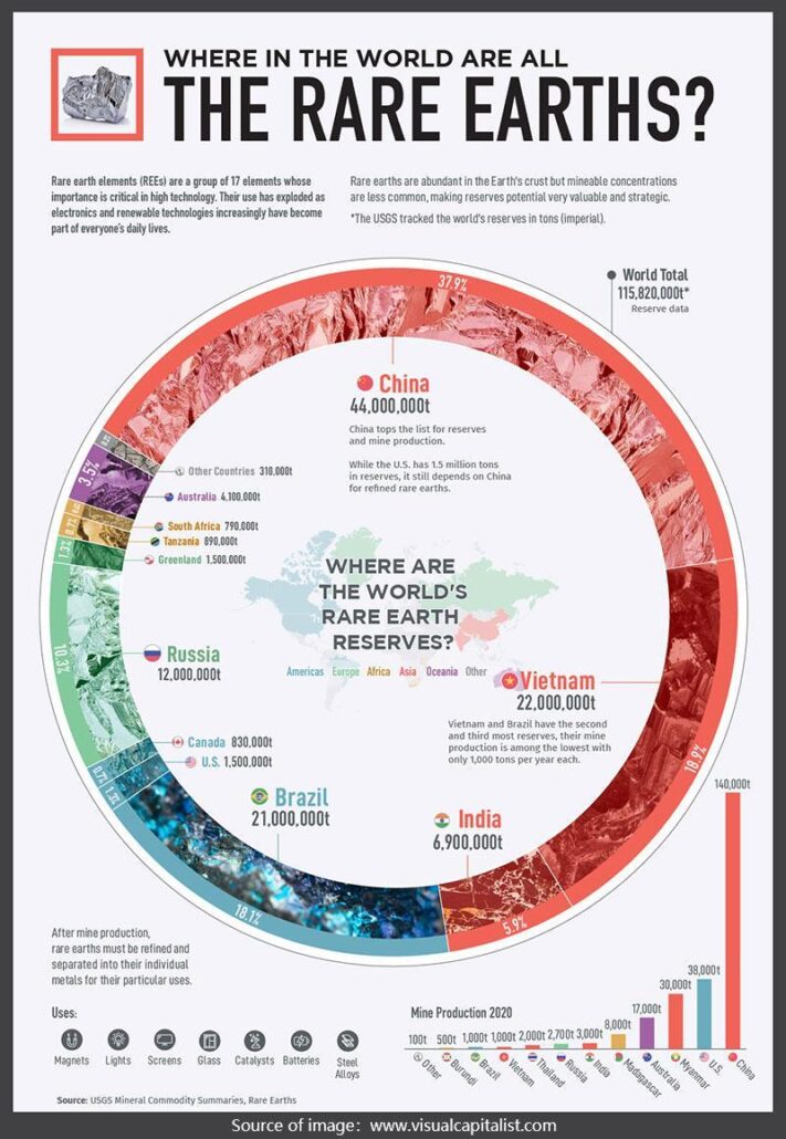 In terms of world reserves of rare-earth minerals China ranks first, Vietnam – second, Brazil – third. India, Australia, Russia, the USA and Canada have rich rare-earth resources.