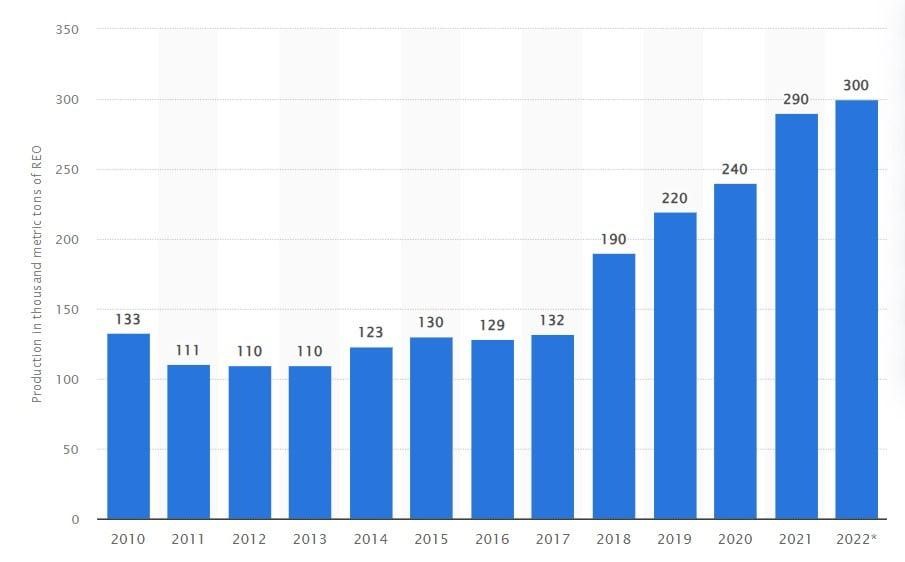 Since the mid of the 1990s China has become the largest producer of rare-earth elements. Currently China is accounted for by about 70% of the world’s rare-earth metal concentrate production and 90% of the finished product.